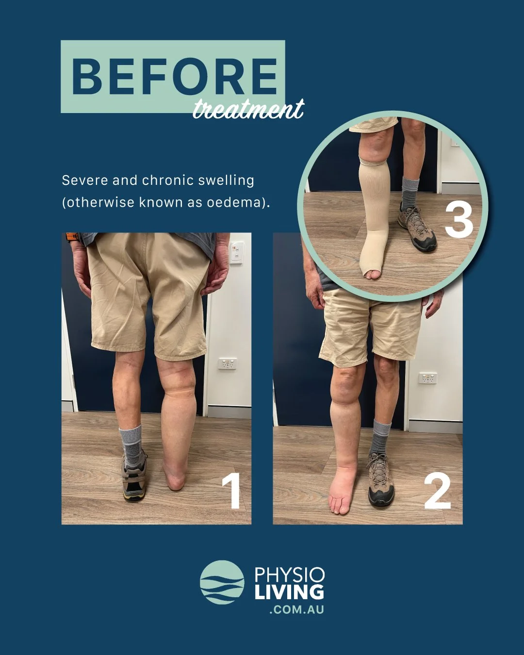 Being an active man who loves swimming in the ocean and walking, the size and heaviness of his leg was causing discomfort and limitations, not only to exercising but what trousers and shoes he could wear. Mr H had widespread pitting oedema, which is where indentations on the skin occur due to lymphatic fluid being built up in the tissues. This is a clinical sign of moderate-severe lymphoedema.